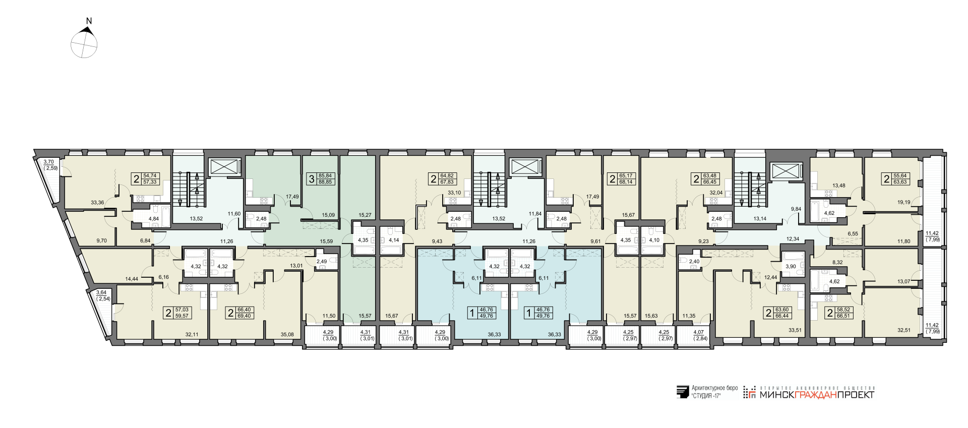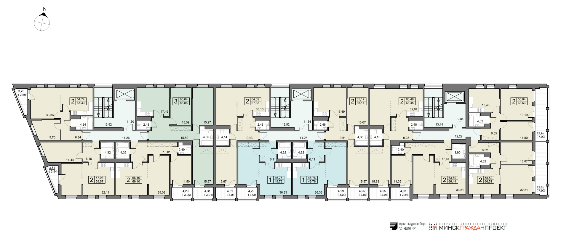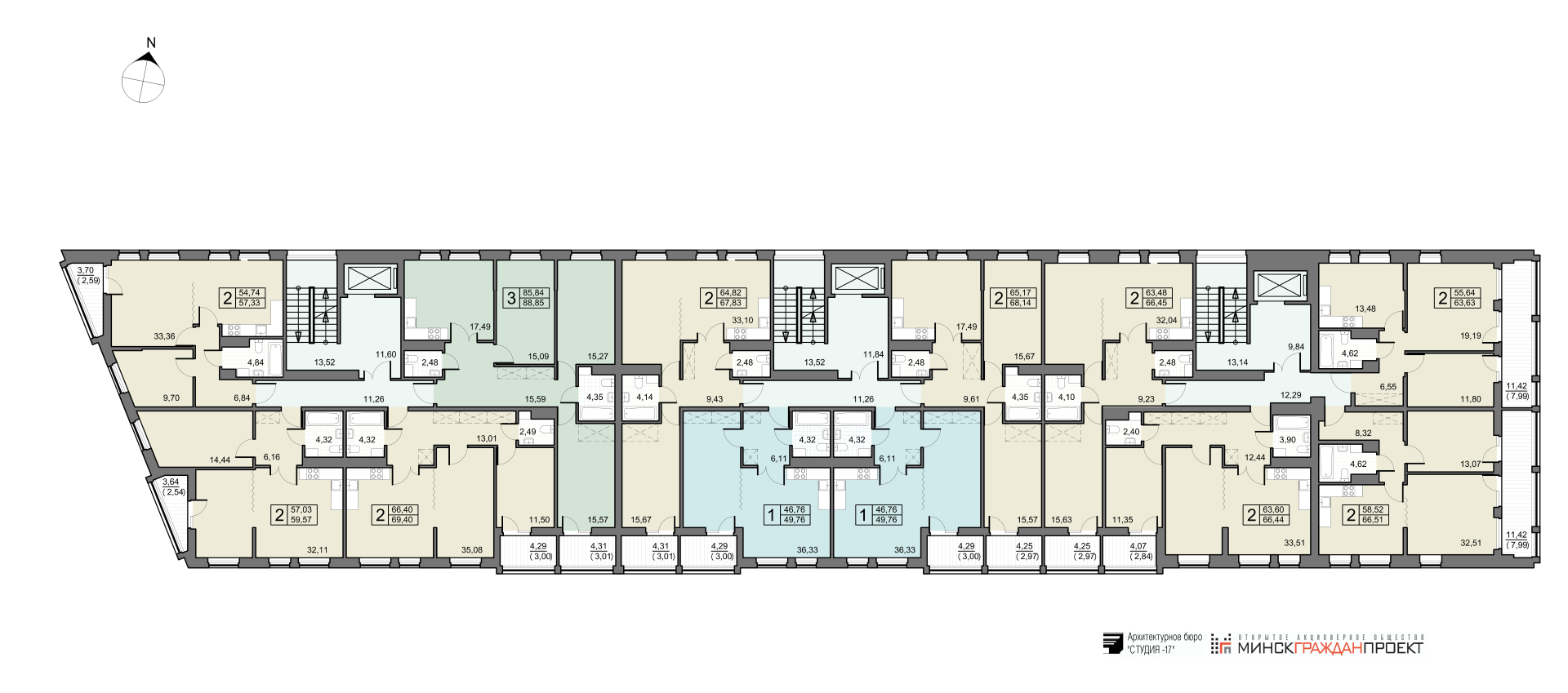 - 2 (две) трехкомнатные квартиры общей площадью от 88,78 до 88,85 кв.м.