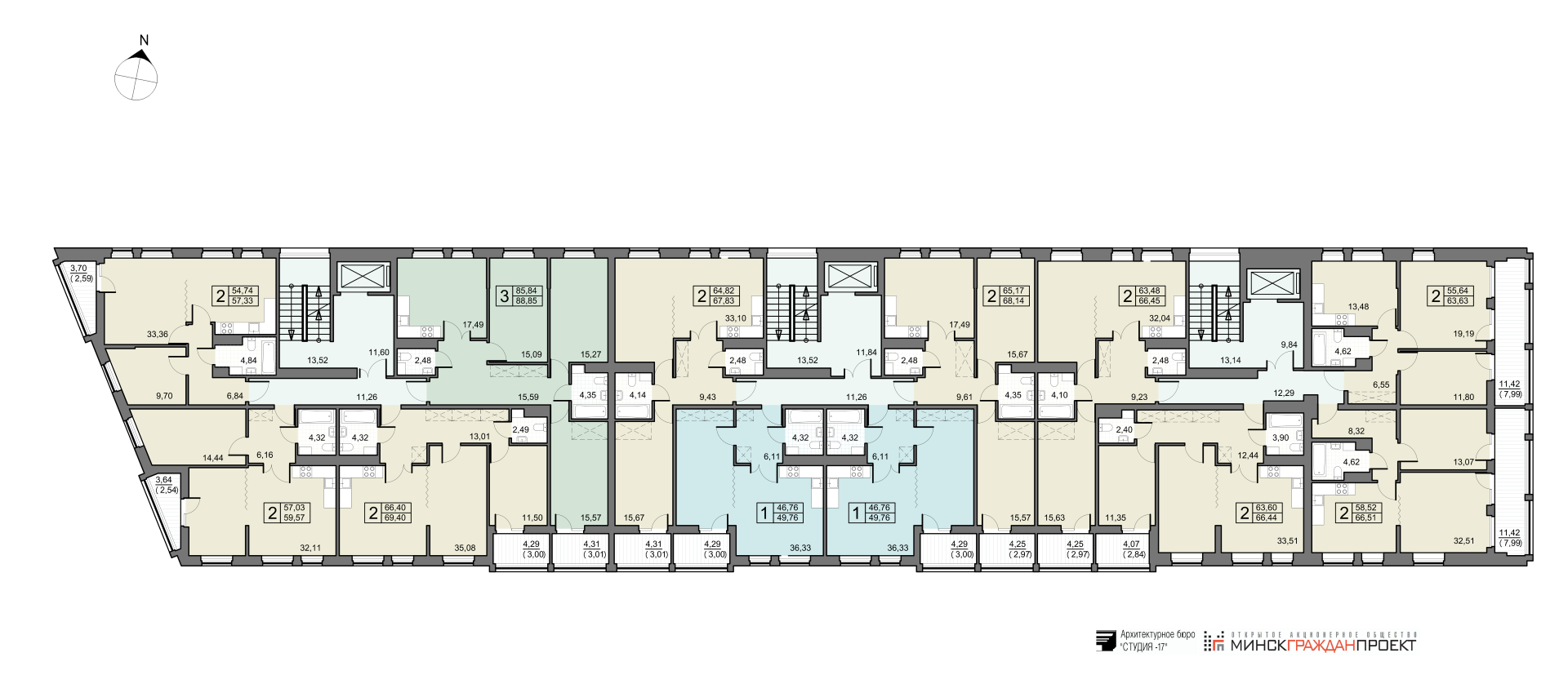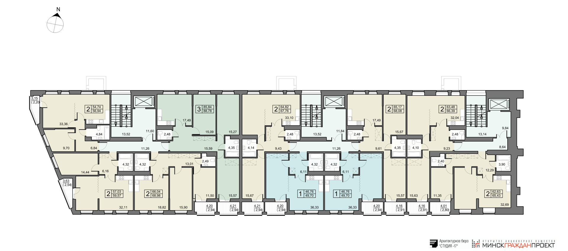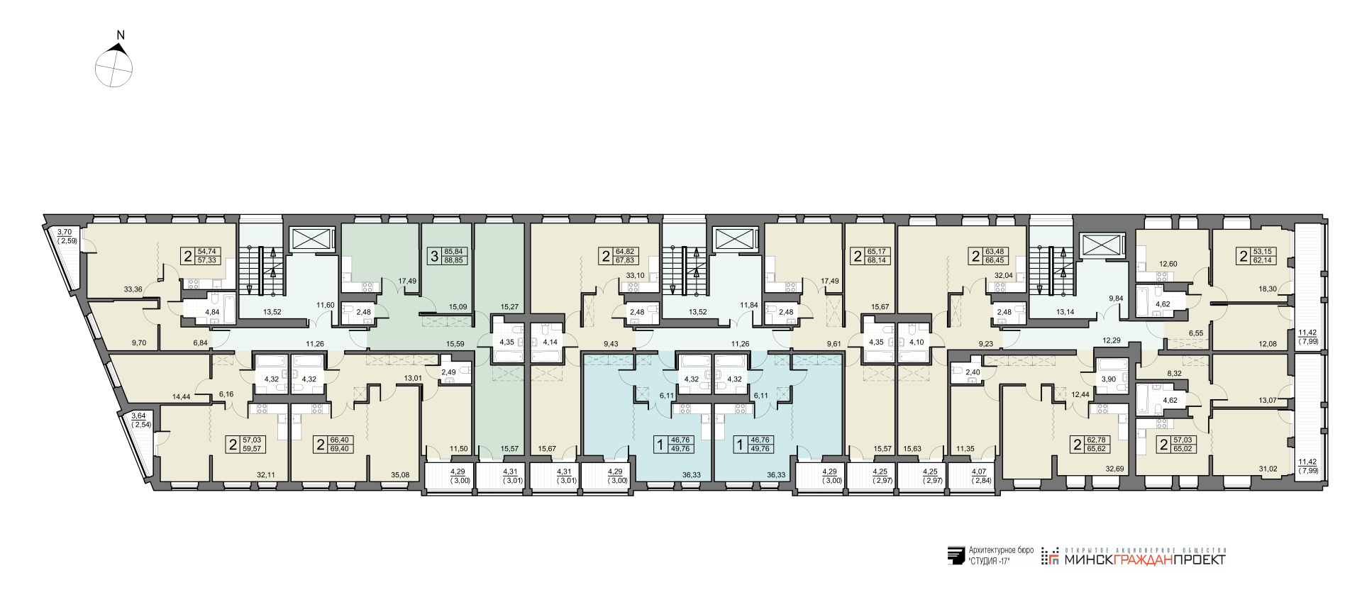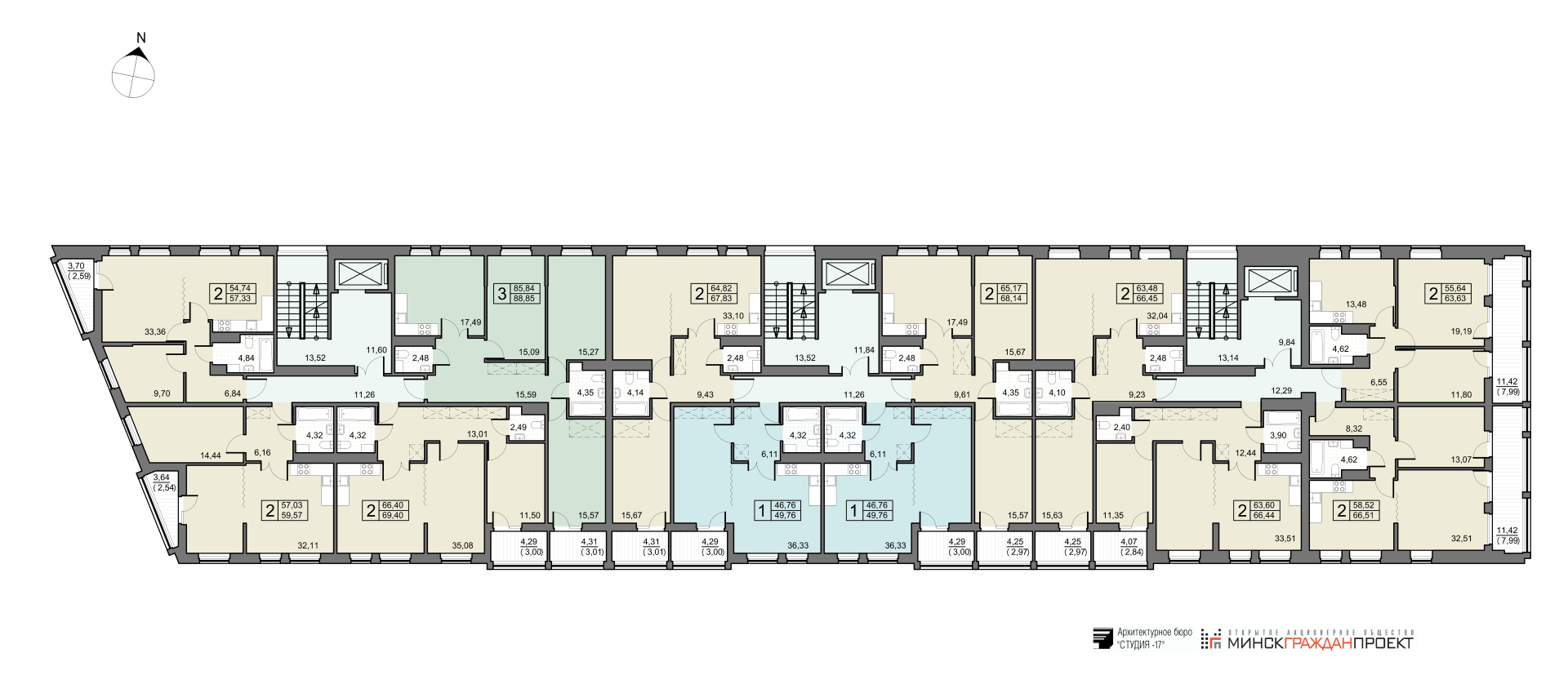 - 2 (две) трехкомнатные квартиры общей площадью от 88,78 до 88,85 кв.м.