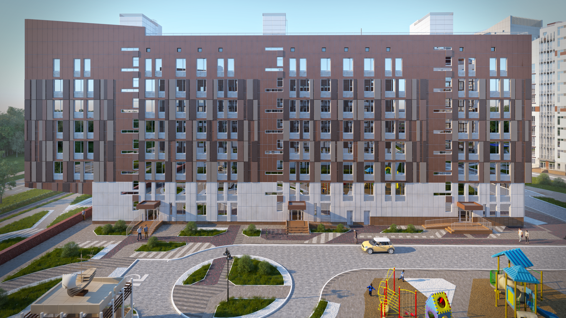 Устройство проездов и тротуаров с покрытием из мелкоразмерной бетонной плитки, устройство хозяйственной площадки из бетона для ТБО, контейнеров для раздельного сбора мусора, установка скамеек, урн, обустройство детских игровых площадок с песочницей, качелями, стоянок для хранения велосипедов, обустройство мест отдыха, озеленение территории.